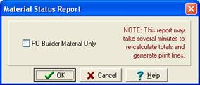 Note: The ‘PO Builder Material Only’ dialog box will prompt for both the Summary and Detail report formats. Generating the Material Status Summary and selecting the PO Builder Material Only box will net the same result as selecting the PO Builder Material Status report option.