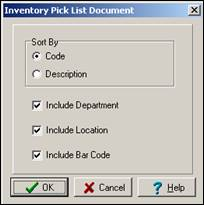 Work Orders contain an area where you can list all of the materials required to fabricate and/or ship the work order. Materials are made up of inventory ‘stock’ items that need to be picked from inventory and specialty items that are purchased directly for the job. The inventory pick list report generates the inventory ‘pick list’ that employees use to pick necessary items from inventory for the selected Job Item. When printing this report, ShopPAK displays the following dialog box to customize how the report looks.