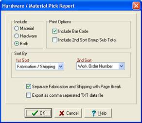Similar to the Inventory Pick report, but this report also includes non-stock material items and separates material needs into two groups: Fabrication and Shipping.