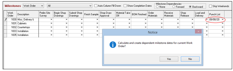 Click OK to recalculate dates. ShopPAK refreshes the milestone grid dates accordingly.