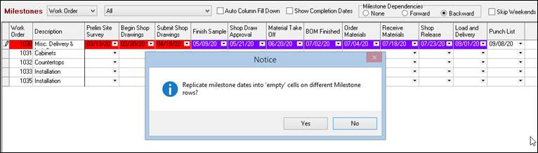 3. Last, press "Yes" when the message box displays asking if you want to fill all of the Milestone grid rows, duplicating dates from the newly added Milestone row.