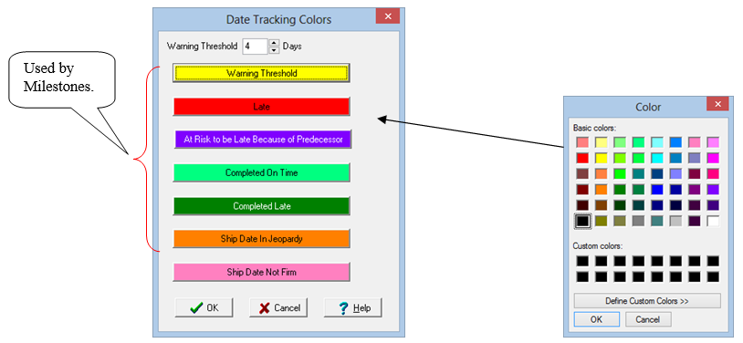 If you define a milestone as being a date, ShopPAK colors milestone cells based on your choice of tracking color. Tracking color is defined via the Define | Date Tracking Color menu item: