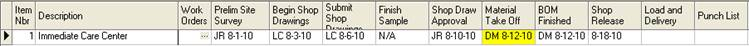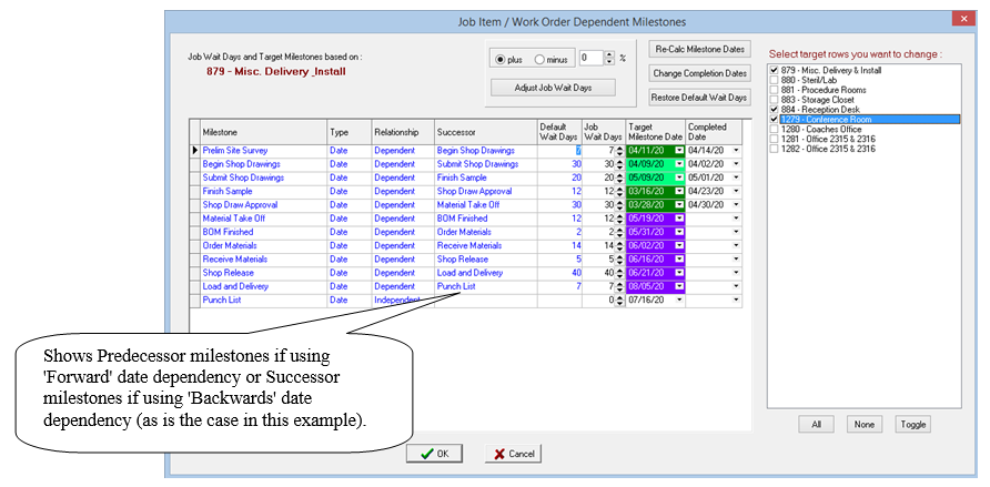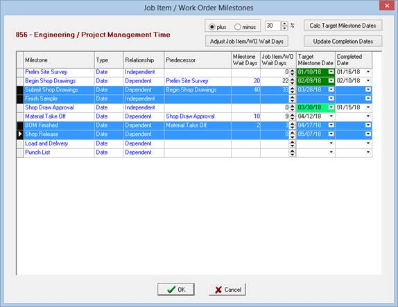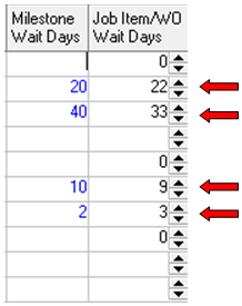 1. Edit Job Item/Work order Wait Days, Target Milestone Date, or Completed Date. This is done directly in the above grid. Changes are reflected in the milestone grid when you OK and close dialog box.