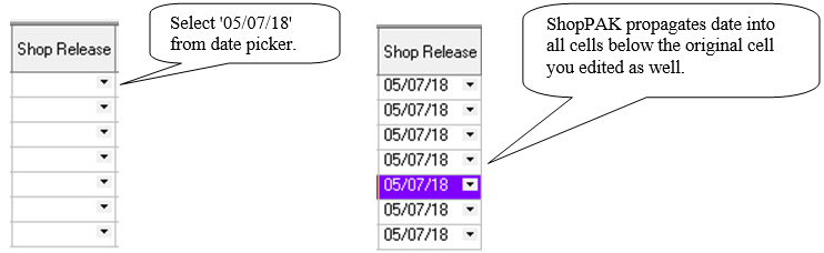 For example, with “Auto Fill Column with same date” checked, if you choose a date in the top cell, ShopPAK automatically propagages the same date to all cells below the cell being edited.