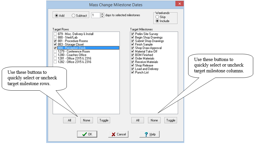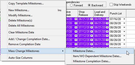 To speed entering and updating milestones, ShopPAK has three powerful mass change functions.