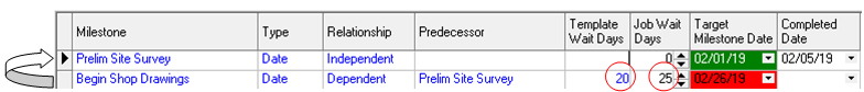 In our example below, we're using 'Forward' data calculation and the milestone à Begin Shop Drawings is dependent on its predecessor milestone à Prelim Site Survey. The start of "Begin Shop Drawings" usually trails "Prelim Site Survey" by 20 days. However in our example we use Job Wait Days to increase wait days to 25 for this particular job.