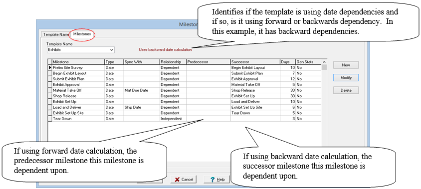When setting up a milestone template, you identify milestone dependencies and the number of days one milestone usually trails or precedes another milestone. In the above example, template information is displayed in blue. These items can't be changed in this dialog box….only in the Template Milestone dialog box. The important columns are Predecessor and Milestone Wait Days. These columns show if a particular milestone is dependent on an earlier milestone, what the predecessor milestone is, and the number of days a dependent milestone typically waits for an earlier milestone to be finished.