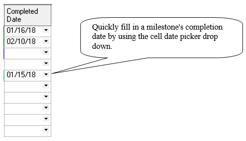 If a milestone is defined as being free form text, enter whatever verbiage you wish into the milestone cell. If the milestone is defined as being a date, then use the drop down date picker and choose correct milestone 'target' date. Note, if you've set up milestone date dependency, changing a milestone will automatically update its dependent milestones.