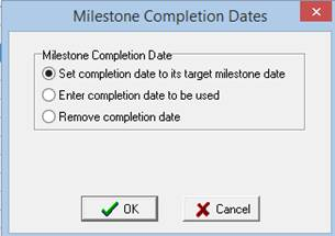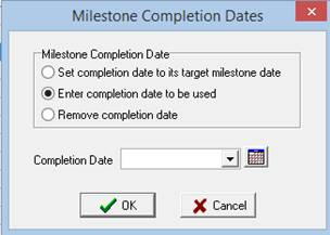 If you want to set the completion date to the milestone target date, click OK. However, if you want to enter a different completion date, click the "Enter completion date to be used" radio button. This displays a Date Picker dialog box. Choose completion date and click OK.