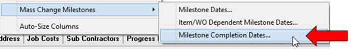 Right mouse click the Job Item or Work Order you want to edit and select "Mass Change Milestones | Item/WO Dependent Milestone Dates" from the pop up menu. This displays the Job Item / Work Order Dependent Milestones dialog box.