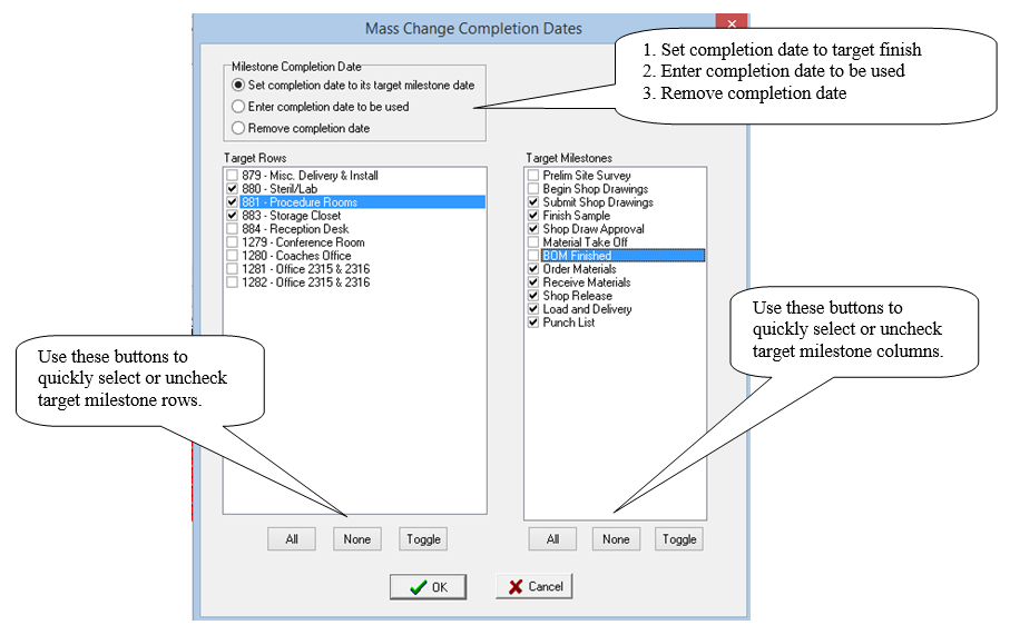 You can use this dialog box to add a completion date to a milestone, as well as, mass change completion dates. Compared to the actual milestone grid, updating completion dates is a lot faster because you work directly with a milestone's completion date cell…