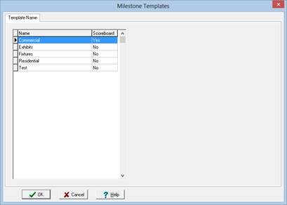 Once you’ve created one or more milestone templates, you can use them in a job's milestone area by right mouse clicking the Milestone grid, and selecting “Copy Milestone Template” from the pop up menu. This displays the Milestone Templates dialog box.