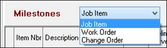 Choose if you want to track milestones at the Job Item, Work Order, or Change Order level. Use the row combo box to pick current view. Note: ShopPAK remembers your last selection across sessions.