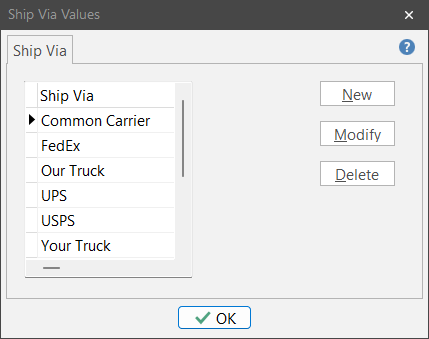 Define the “Ship Via” values that you typically use. When creating purchase orders and packing slips, you’ll be able to choose often used phrases from a pre-populated list to save time and increase consistency.