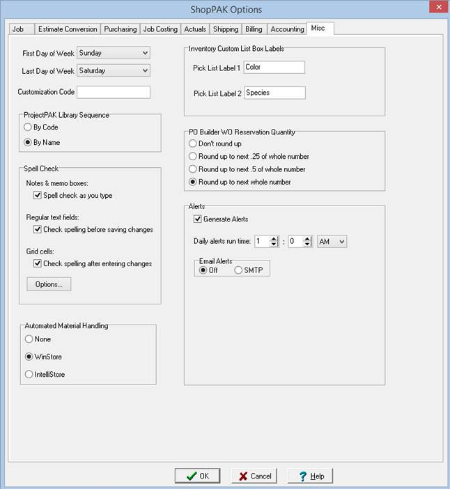 Select the first/last day of the workweek. Several ShopPAK forms and weekly reports will group information based on the first and last day of the week. The “Apply Overtime Rules” tool will also use these values when determining weekly overtime thresholds. See “Chapter 20 – ShopPAK Tools”, page 9 for detailed information about “Apply Overtime”.