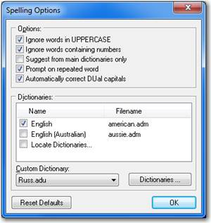 Clicking the Options button displays the Spelling Options dialog box. Use options to configure spell checking behavior and dictionaries you wish to use.