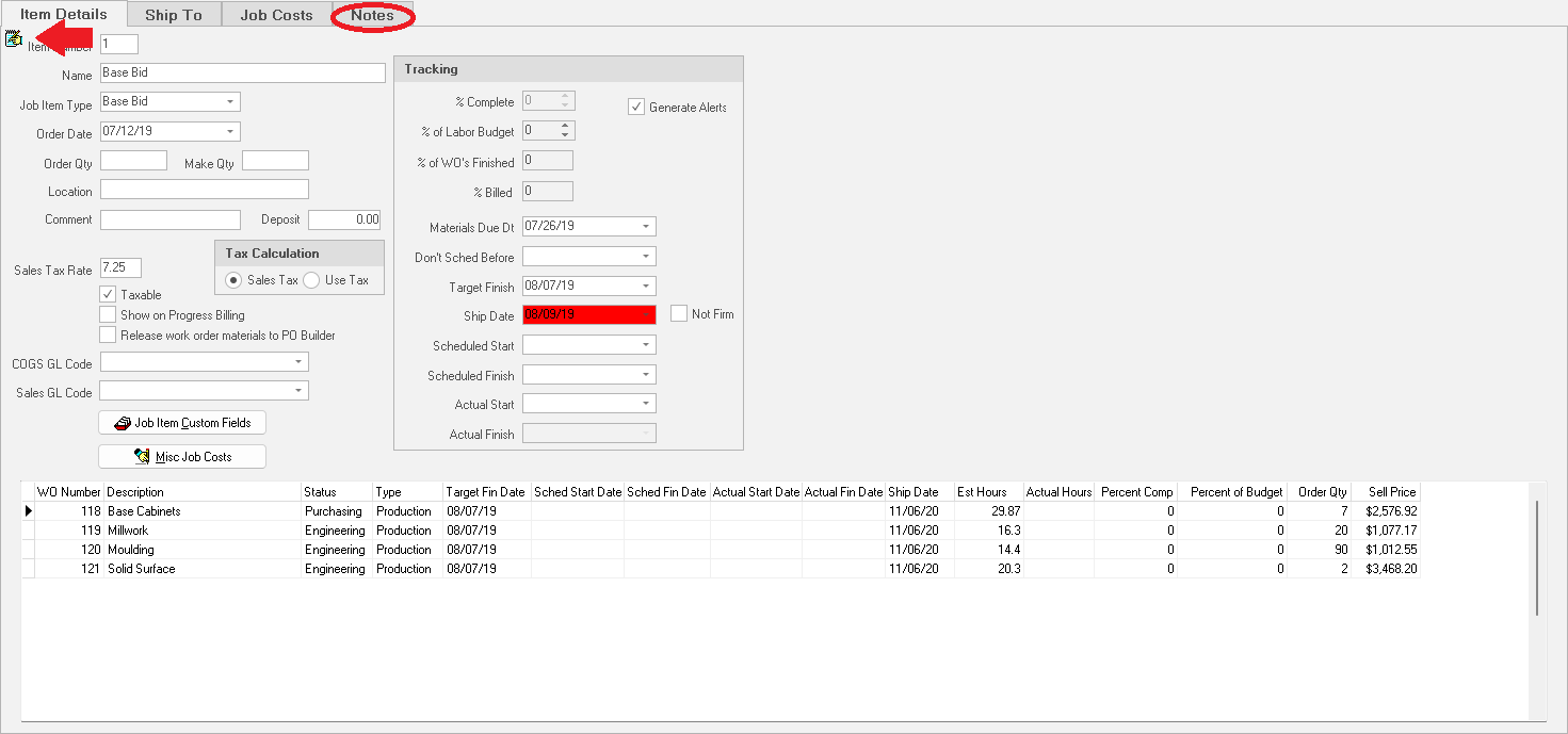 Notes The fourth sub tab, Notes, gives you a free-form area to record notes about the job item. If a Job Item has notes, ShopPAK displays a notes icon in the upper left hand corner of the Item Details sub tab.