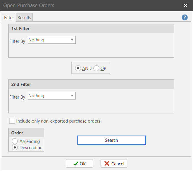 Use “Filter One” and/or “Filter Two” to pinpoint the set of POs you want ShopPAK to find. If you use both filters, make sure you select the right matching value. Use “AND” if you want to limit the list of POs returned from the database. Use “OR” if you want to expand the list of POs returned from the database.