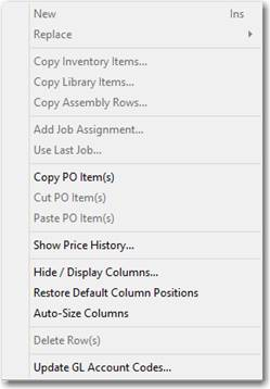 Right mouse click the ‘PO Items’ grid to display the PO Items grid’s pop up menu: