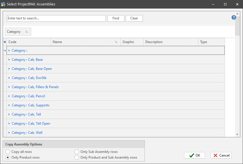 Choose the correct copy option so ShopPAK knows which assembly rows to copy into the Product grid.