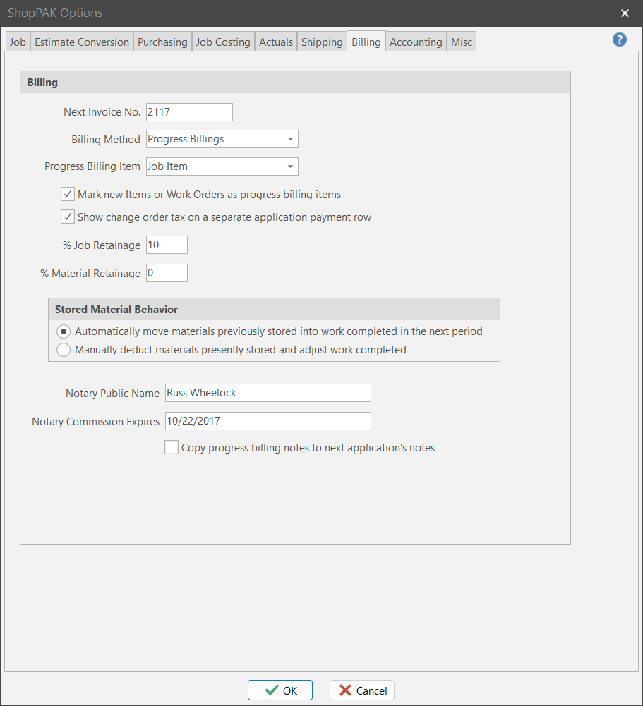 Before using progress billing, make sure you’ve correctly set up your progress billing defaults. These are located in the ShopPAK Options dialog box on the Billing” tab.