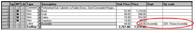 Click the “OK” button to return the selected values to the estimate or assembly window. In the example that follows, we’ve just assigned the department and operation code to the “Labor” row on line 6.