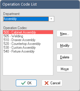 Use the “New”, “Modify”, and “Delete” and “Move” buttons to manipulate department values. Each operation code has a 1-3 character code and up to a 22 character op code description.