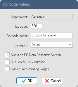TIP: When defining op codes, list them all first on paper and assign numbers that are logically related. For example, make all the op codes that are associated with a particular department start in the same range (e.g. 305, 309, 315, etc.). Leave extra numbers available in case you add new op codes later (e.g. don’t create op codes 301, 302, 303...instead, create op codes 301, 305, 310, etc.). If you want to capture indirect labor hours, don’t forget indirect op codes for maintenance, cleanup, meetings, etc.