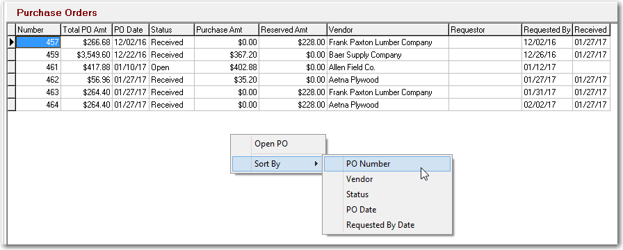 A handy feature is automatically opening a PO from this form. Right mouse click the Purchase Order grid and select “Open PO” from the pop up menu. ShopPAK navigates to the Purchase Order tab and opens the requested purchase order.