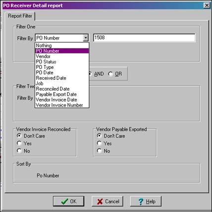 This displays the “PO Receivers Detail Report” dialog box. Use this dialog box to enter filters to limit the report to just the information you are seeking.