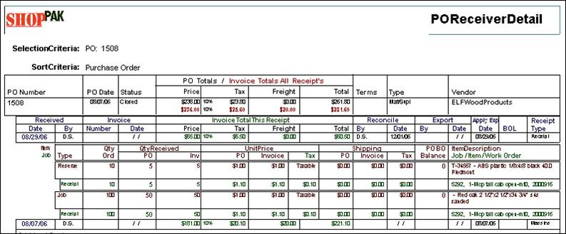 Select Reports | Purchase Orders | PO Receiver Details from the ShopPAK menu to generate the ‘PO Receiver Details’ report. This report not only has receiver details, but if the receiver has been reconciled against a vendor invoice, reconciled invoice information is also included on the report.