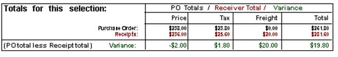 A Totals section prints at the bottom that summarizes any Receiver to Purchase Order variances: