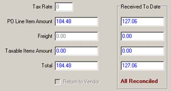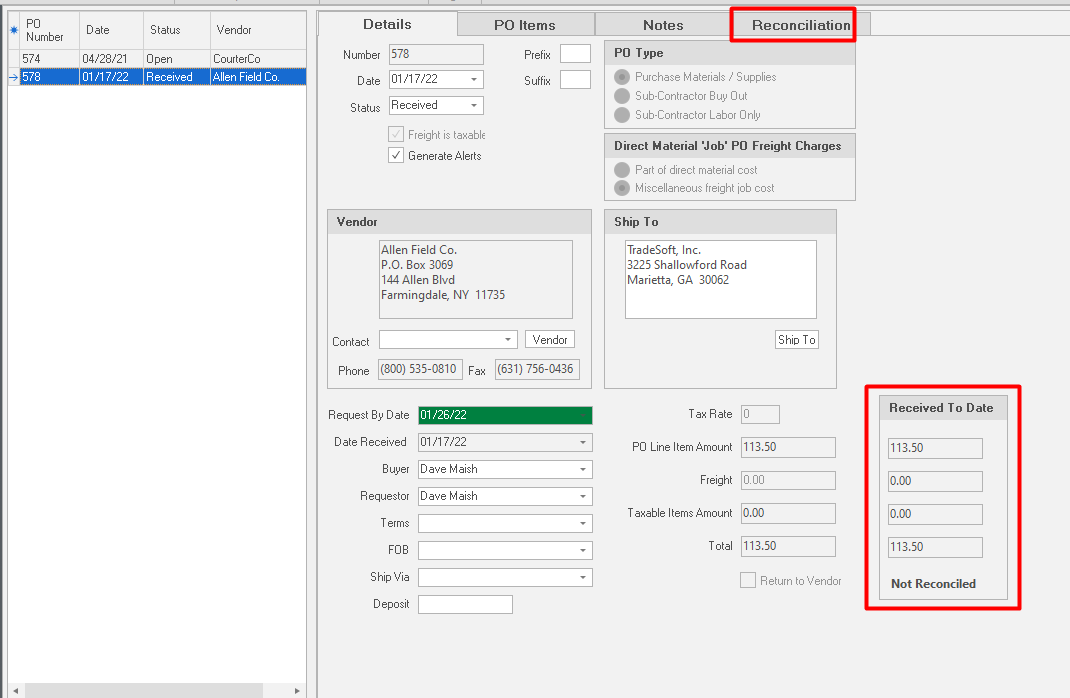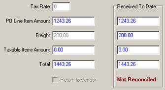 Once a purchase order has been received, ShopPAK displays reconciliation summary information: