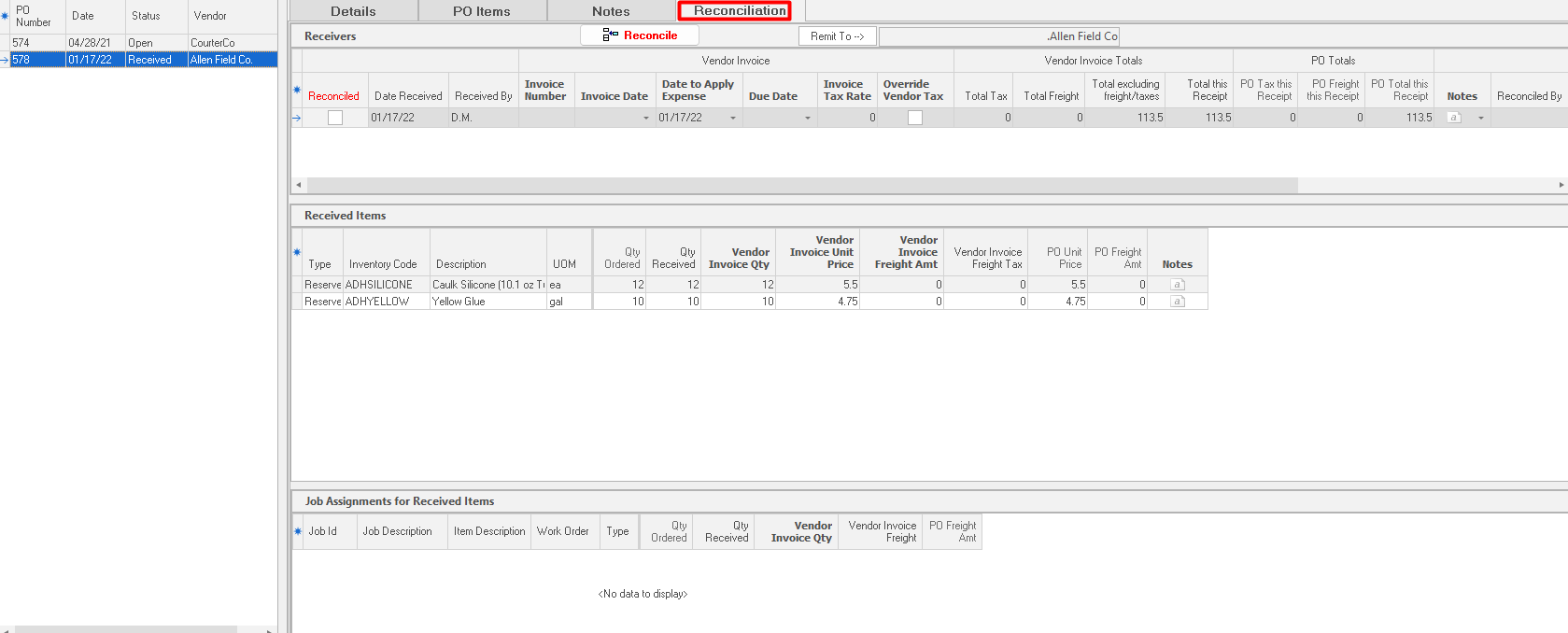 Reconciliation happens on the Purchasing tab. See “Purchasing” for instructions on reconciling vendor invoices.