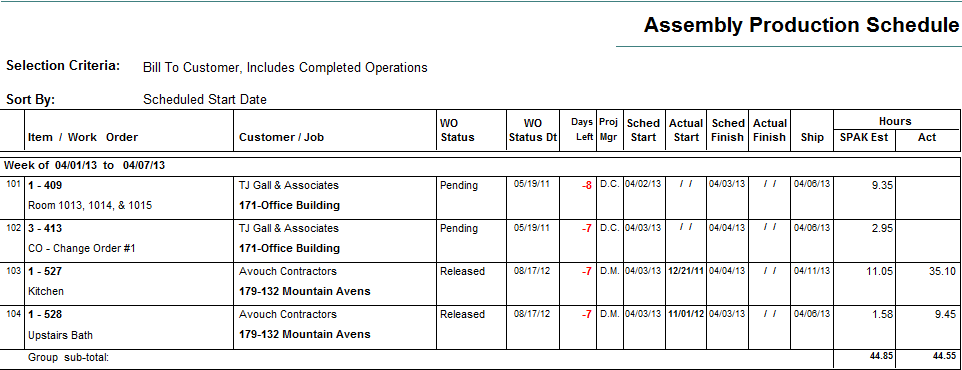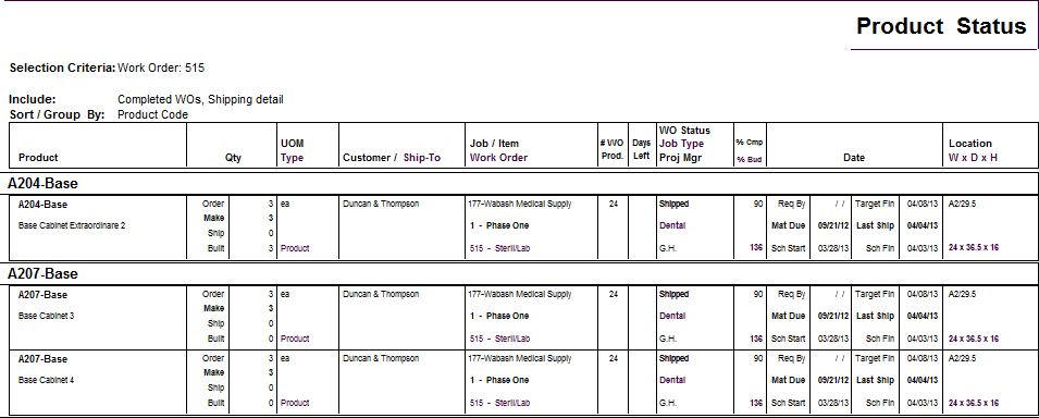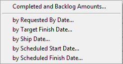 The work order production schedule reports allow you to sequence the report by a number of dates including Scheduled Start or Finish, Target Start or Finish, Ship, Material Due and Request By. The report calculates ‘Days Left’ so you can easily see if you are on target or slipping.