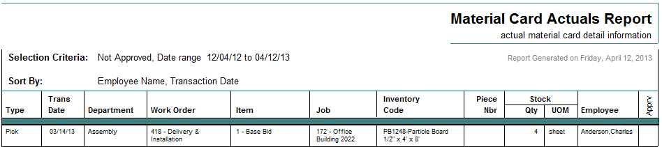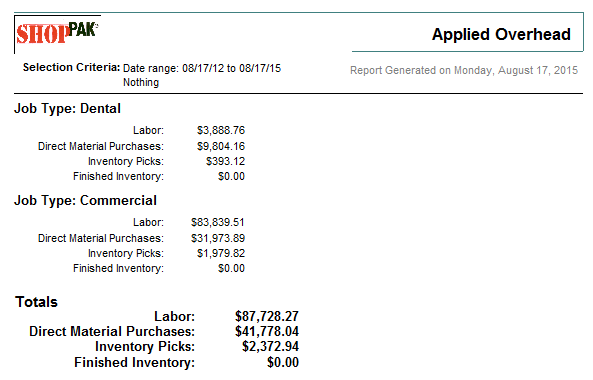 The Applied Overhead report shows applied overhead costs by cost type for a particular date range. Use it to better understand what your overhead costs are when analyzing future overhead burden absorption percentages and rates.