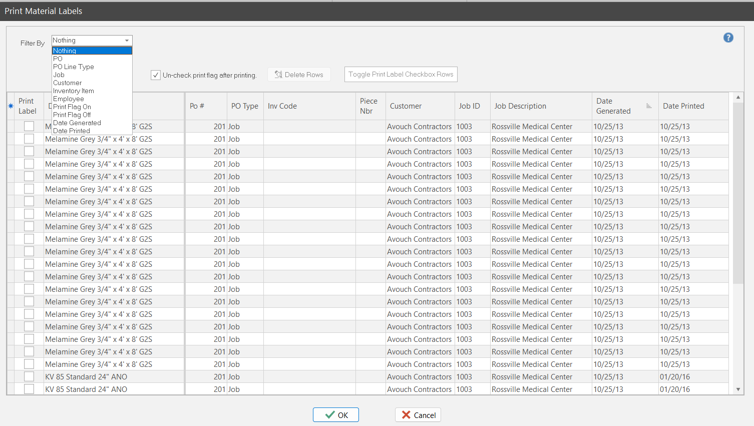 The dialog not only controls material label printing. It also controls deleting generated labels. It is a good ideas to delete generated labels after you print them so you don’t have printed labels in your material label print queue.