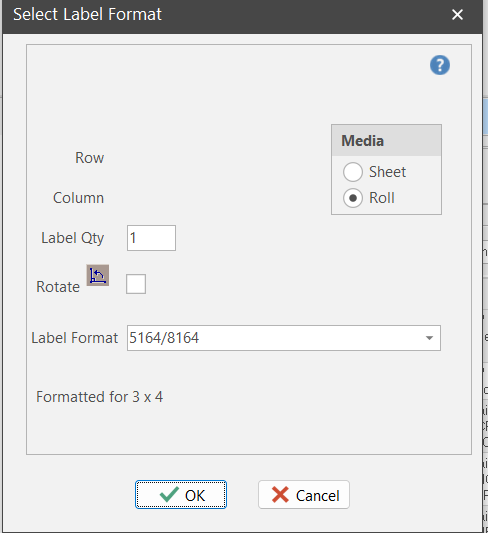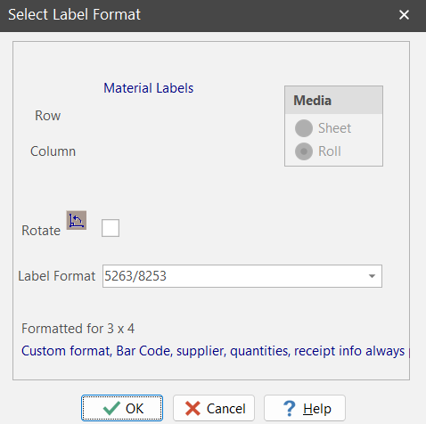 You have several options for label size and formatting. See "Setup and Options" for details on setting up material label defaults. Your defaults flow into the print setup dialog box. If you wish, you can override label size and format.