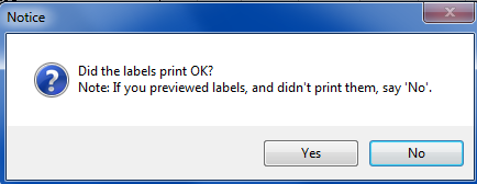 After you print the labels, ShopPAK displays a message box asking if the labels printed OK.