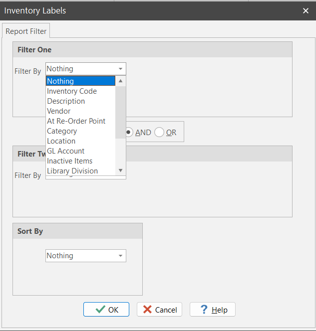 Tell ShopPAK which label media you want to use. Next, ShopPAK displays a dialog so you can pinpoint which inventory labels you want to produce. Use the filter and sort controls to generate only the labels you want to print.