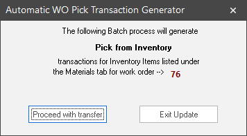 ShopPAK displays a dialog box that alerts you that you’re about to trigger an Auto Pick for this Work Order, and asks if you want to proceed or not. Click “Proceed” to contine and “Exit” to cancel the auto ‘Pick’ generation routine.