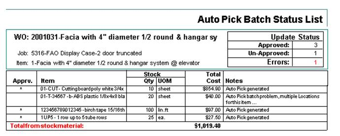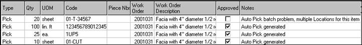 ShopPAK updates the Material Card form with all of the generated ‘Pick’ transactions. Any transaction that generated an error will be available here so it can be Re-Approved once the problem has been solved.