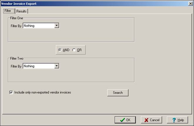 Vendor Invoice Export has two tabs: Filter and Results.
