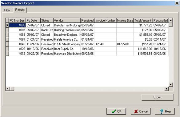Second, export the list of vendor invoices from the “Results” tab by clicking the “Export” button. This tells ShopPAK to read necessary information from the ShopPAK database and format the export file according to the import requirements of your accounting package.