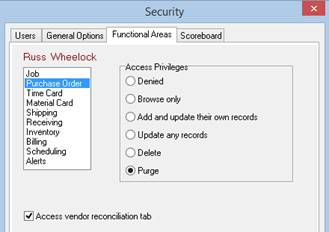 Invoice reconciliation information is only visible to ShopPAK users with the appropriate level of security privilege. Before attempting to reconcile vendor invoices, user needs to be given reconciliation tab access from the ShopPAK system administrator via the Security dialog box. Choose Define | Security from the ShopPAK menu. On the “Functional Areas” tab choose Purchase Order and place a check in the "Access vendor reconciliation tab" checkbox.