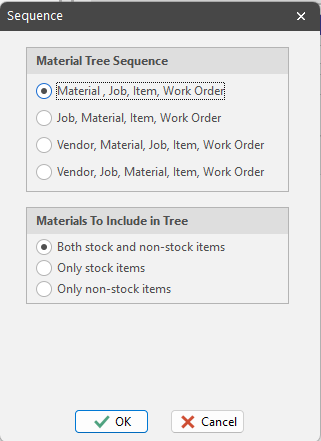 If you sequence materials by job, you can filter materials to only show those materials where you are the project manager. In other words, if you organize the material tree by job, it is likely that you only want to purchase materials for those jobs that you are managing.