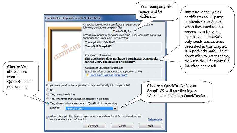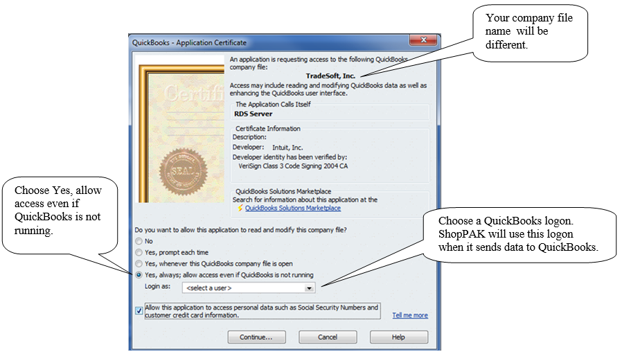 Note: ShopPAK will not access personal data such as social security or credit cards, but enabling this option allows ShopPAK to make sure a QuickBooks employee is set up properly to accept payroll hours (and fix any problems found prior to exporting data). If you choose not to allow personal data access, there will just be an error notification during the export if a problem is encountered.