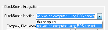 Remote means that the QuickBooks’ database is located on another PC, and ShopPAK will need to connect to the database across the network. Choose ‘networked computer (using RDS server)’ to connect remotely.