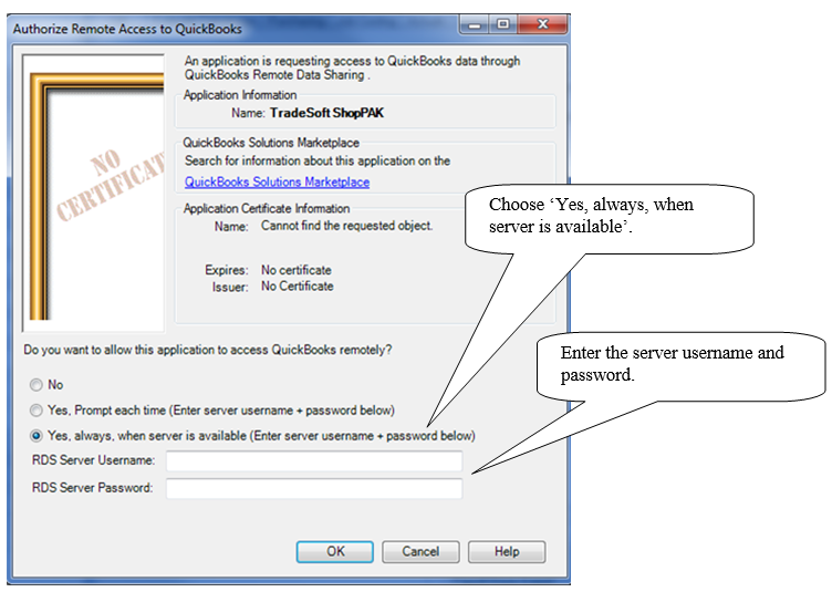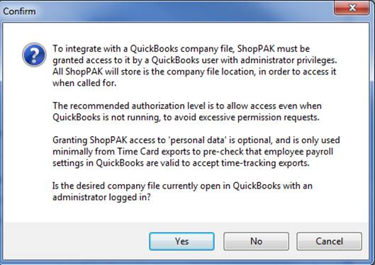 Read through requirements for adding a QuickBooks company to ShopPAK. If you can proceed, click Yes. (This only has to be done once). You will then receive a prompt from the RDS client.