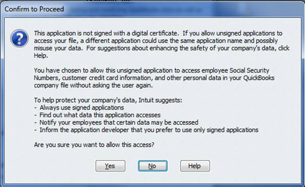 9. The first time you start the RDS server, focus will shift to QuickBooks. QuickBooks displays the following dialog box: